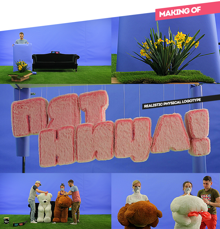 The team has developed a scene – meadow with trees, flowers, lawn, shrubs, as well as a sofa and a floor lamp, a symbol for «apartment». They also created separately fur logo in order to bring a spring, warm and plush atmosphere. Through this video shooting, we made friends with a bunch of cool guys – real fun professionals. Thanks to all of them! Rrrrrr!